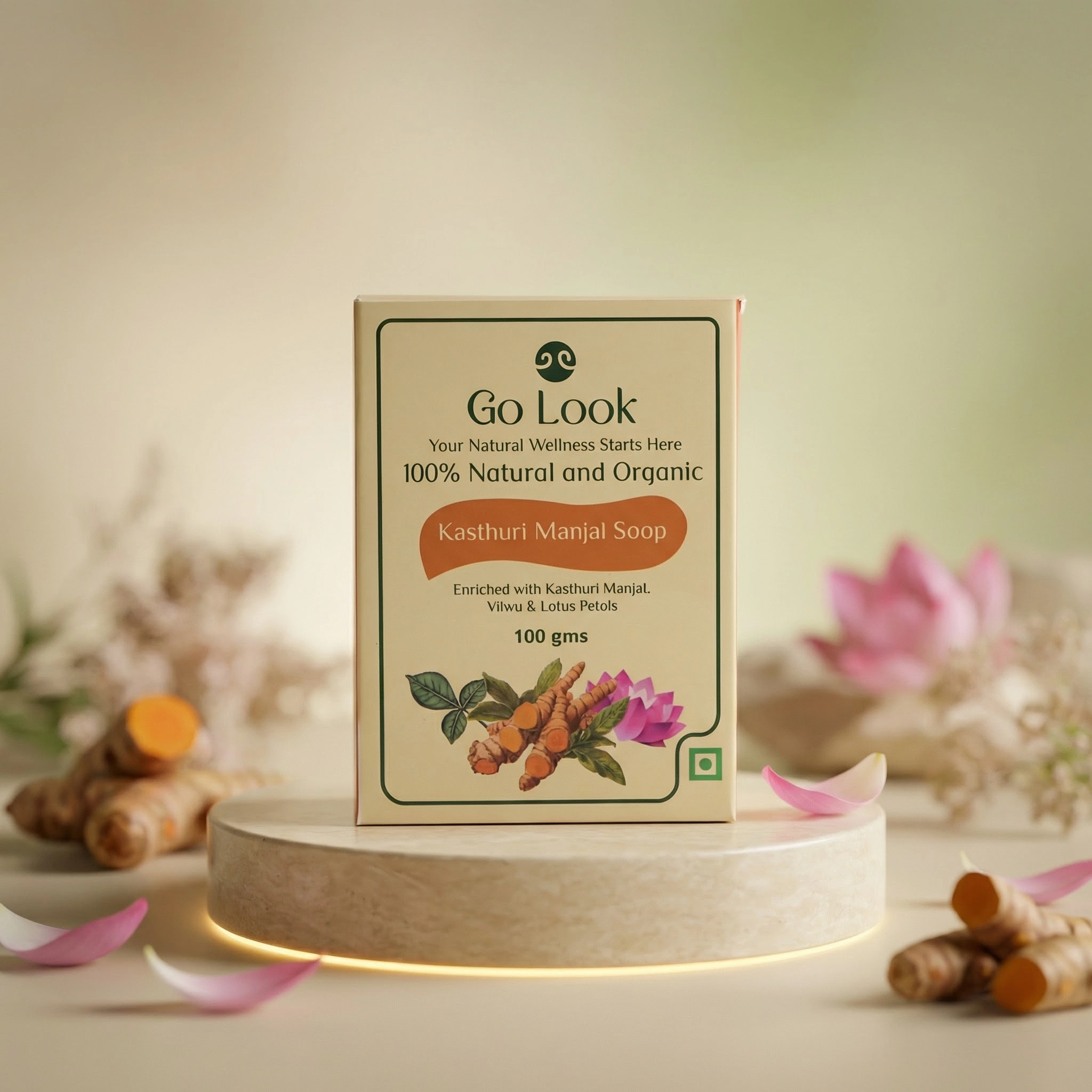 A 100% organic and natural handcrafted soap enriched with kasthuri manjal, vilwa, lotus extracts, and nourishing plant oils to gently cleanse and revitalize your skin. Free from harsh chemicals, artificial fragrances, and synthetic additives, it supports natural glow, deep cleansing, and smooth, well-nourished skin. Suitable for all skin types, it leaves your skin refreshed, soft, and naturally radiant.
