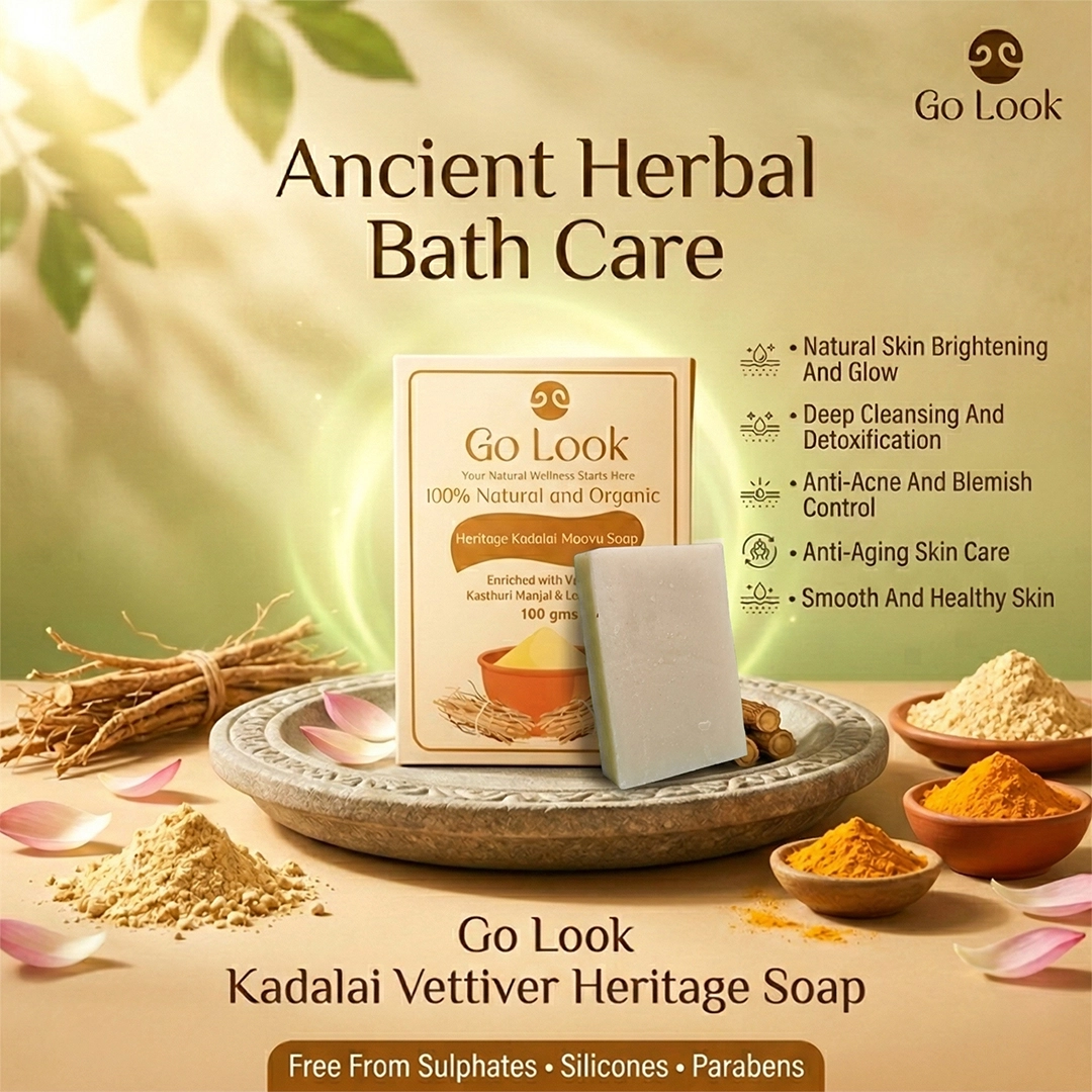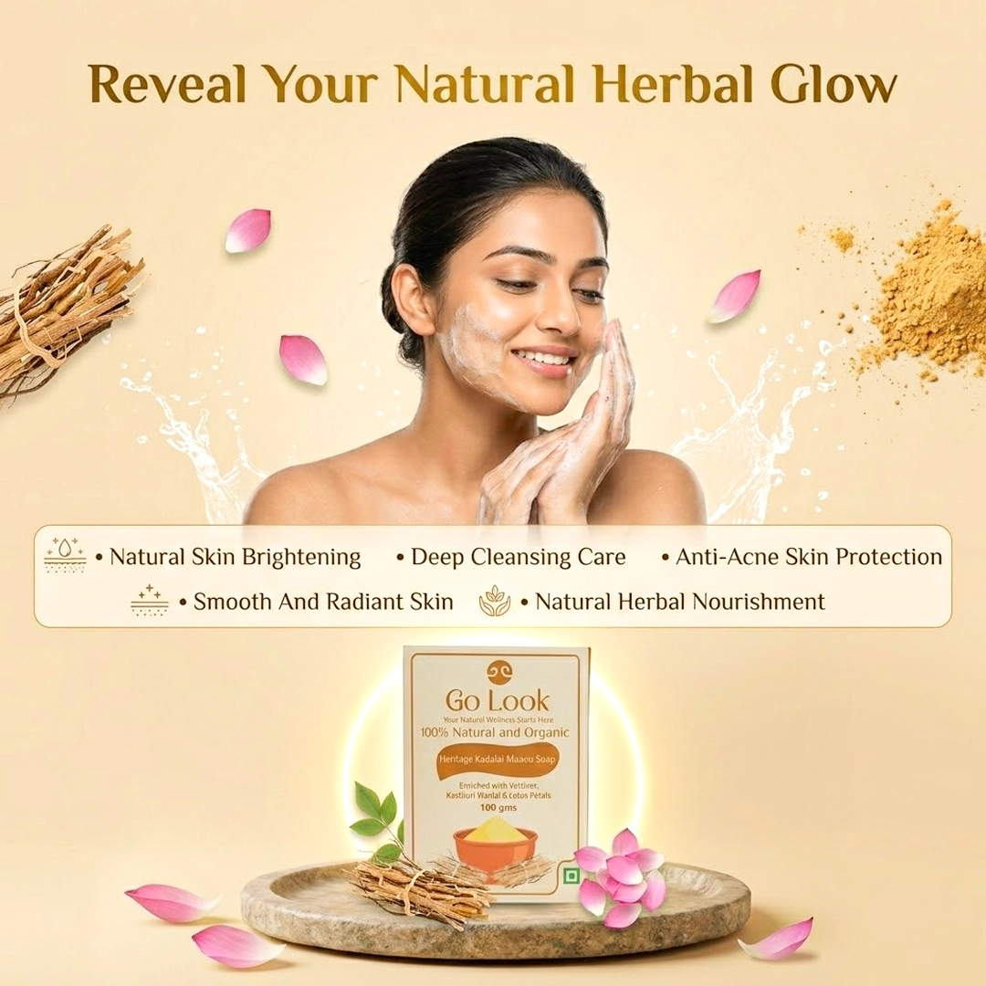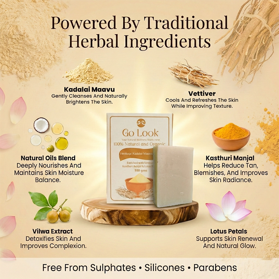 Ingredients : Pure & Organic Kadalai Maavu, Vettiver Extracts, Kasthuri Manjal (Wild Turmeric) powder and extracts, along with turmeric oil, lotus petals powder, Vilwa powder & extracts, coconut oil, castor oil, olive oil, and essential oils