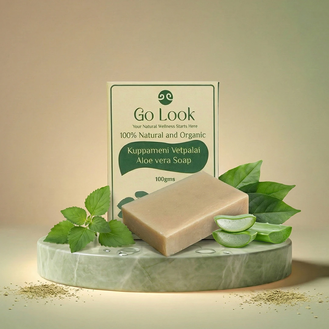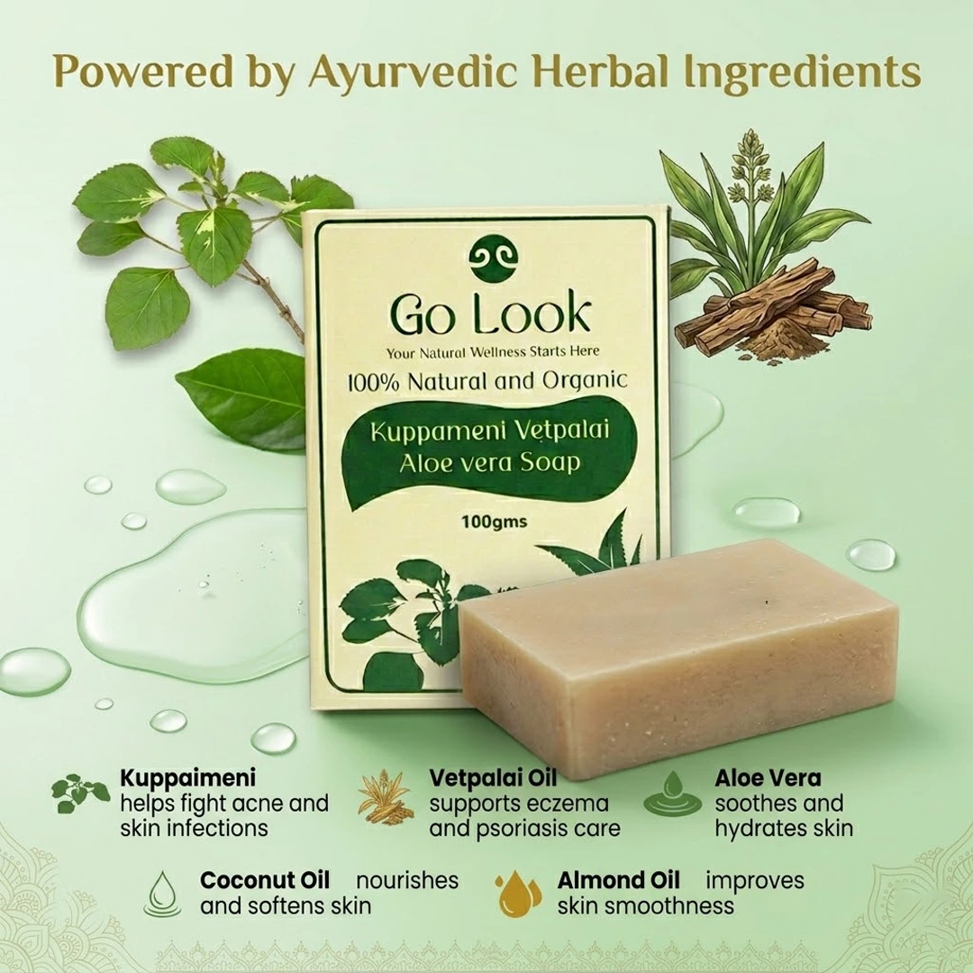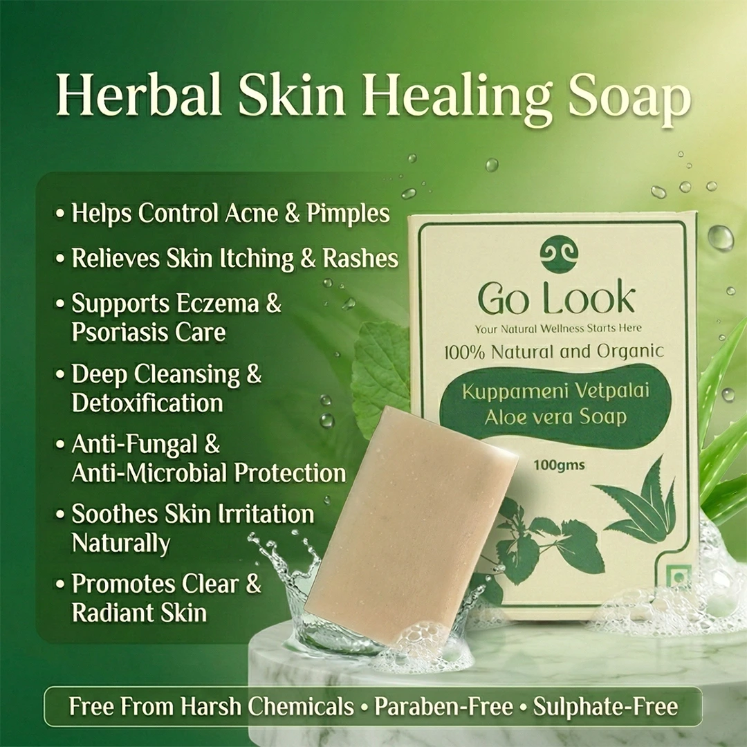 A 100% organic and natural handcrafted Ayurvedic soap formulated with Kuppameni, vetpalai oil, aloe vera, and nourishing plant oils to gently cleanse and soothe the skin. Designed to help relieve itching, dryness, rashes, and irritation, it supports healthier, calmer-looking skin with regular use. Free from harsh chemicals, parabens, and sulphates, it leaves your skin clean, soft, and balanced even in hard water conditions.