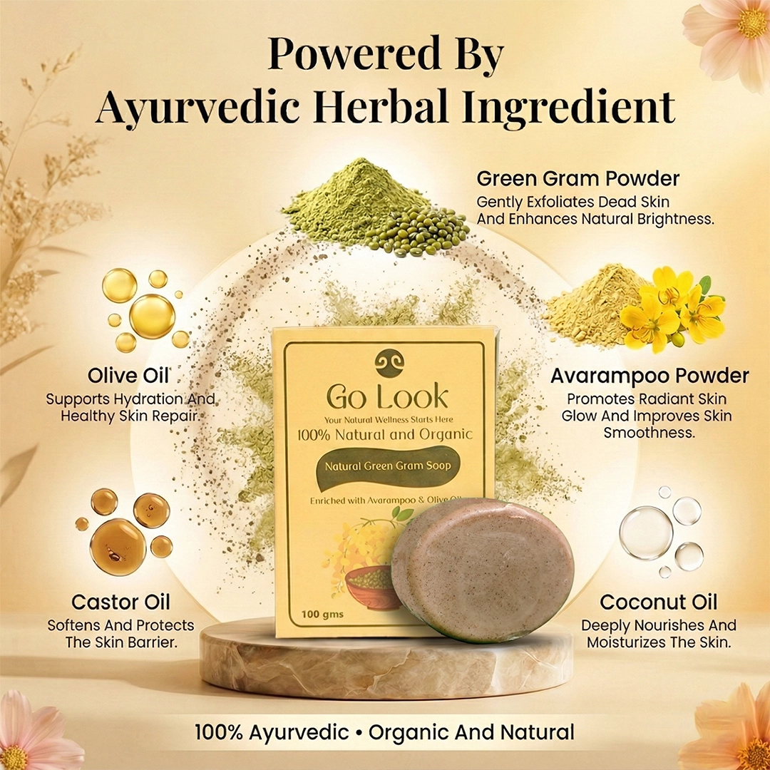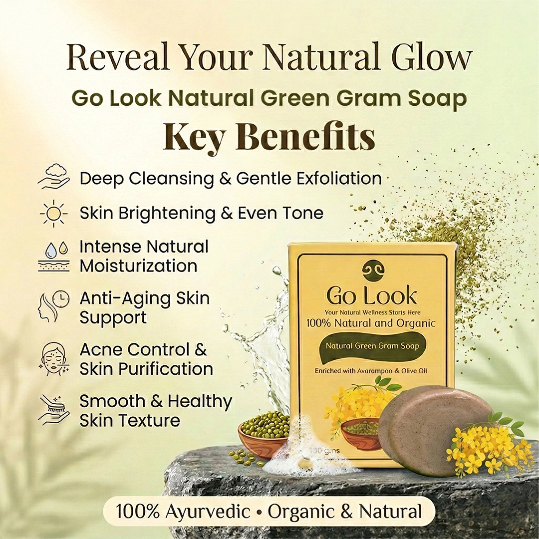 A 100% organic and handcrafted herbal soap enriched with green gram and avarampoo to gently cleanse, exfoliate, and brighten the skin. This natural formula supports moisturization, acne control, and anti-aging benefits while improving overall skin texture. Suitable for all skin types, it leaves your skin soft, refreshed, and naturally radiant after every wash.